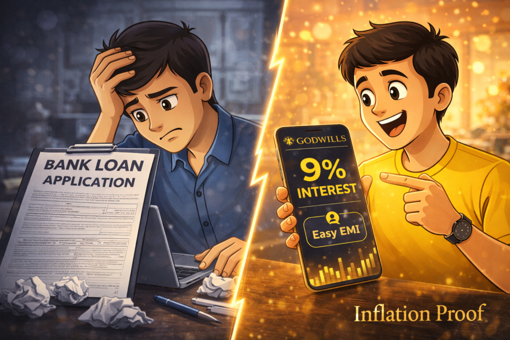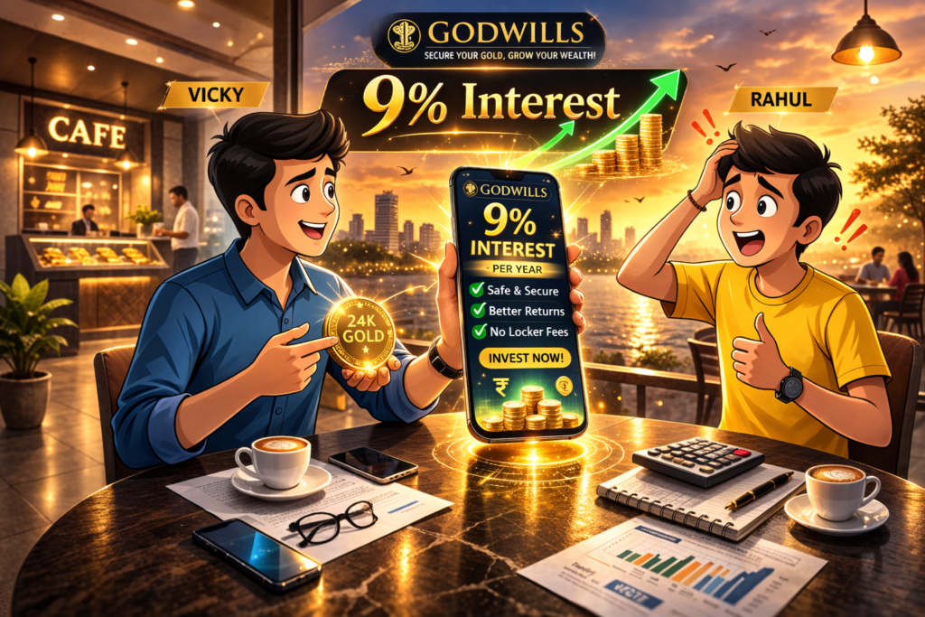 Over coffee, Rahul’s friend Vicky noticed his tension. Vicky smiled and shared a secret: “Stop waiting for prices to drop, Rahul! I bought my gold through Godwills Bullion. They offer a ‘Loan to Buy Gold’ at just 9% interest. I locked in today’s price and I’m paying in easy EMIs.”