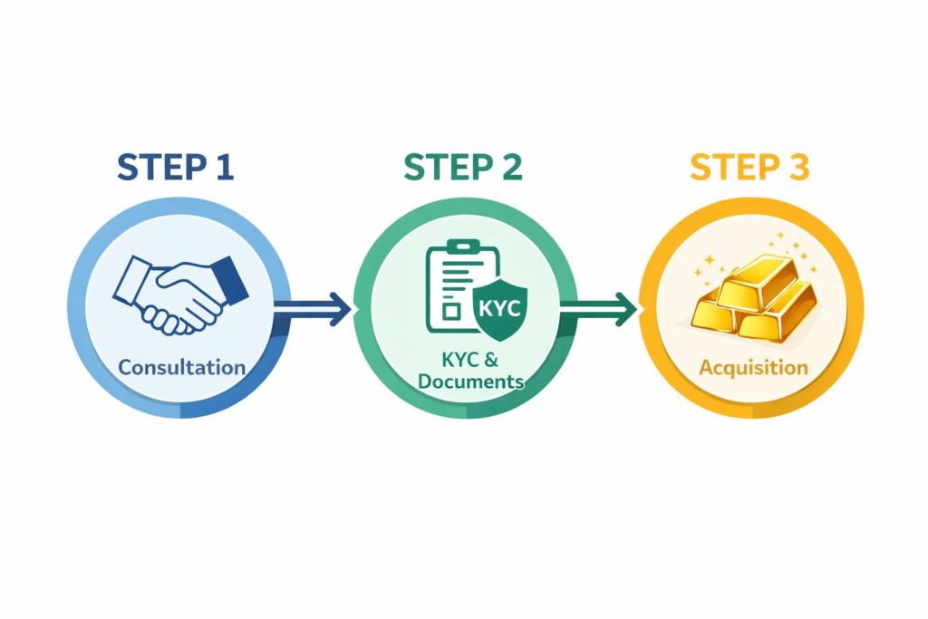 • Once approved, your chosen quantity of 24K gold is purchased at today’s market rate. You become the owner, and your gold is either securely stored or delivered, as per your preference
